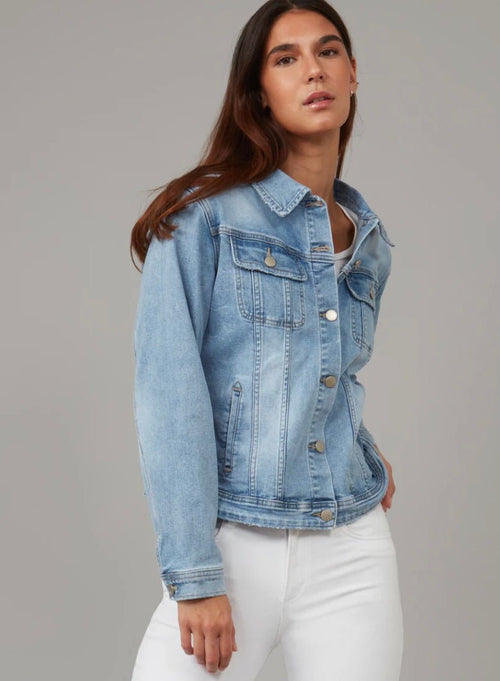 The GABRIELLA Classic Denim Shirt delivers effortless versatility with premium 4-way stretch fabric that moves with you while maintaining its structure. Cut to true size with a refined silhouette, this essential layer features functional chest and side pockets for practical style. The soft-touch denim blends 62% cotton, 17% polyester, 19% viscose, and 2% spandex for durability and comfort across multiple washes. Available in a stone blue skyline wash, it transitions seamlessly from season to season. Model pictured is 5'9" wearing size small. Machine wash and tumble dry low for easy care.