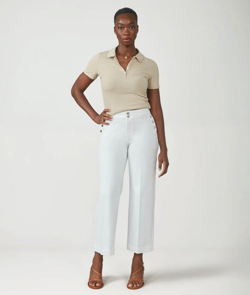 The Colette-OWHT High Rise Wide Leg in White is the epitome of effortless style, complete with seamed pockets and elegant silver hardware buttons. The tailored front pleating on both legs offers a touch of maritime inspiration, combining classic elegance with modern flair. These jeans are TRUE TO SIZE and feature a 10.25" front rise, 30" inseam, and 3" folded hem.